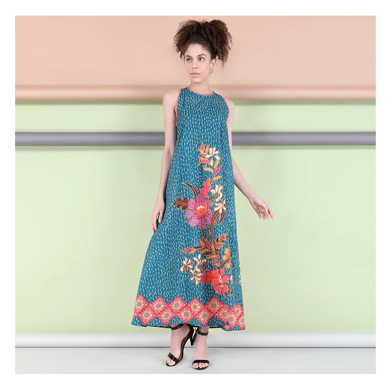Our latest addition dress is a gorgeous piece. This adorable maxi-length dress features Indonesian batik inspired floral print, hand interlaced round neckline, flounce hem with a beautiful pleated fall, and broad armholes. This statement dress also offers a comfortable fabric. Pair this with sandals and a denim jacket to complete the look.