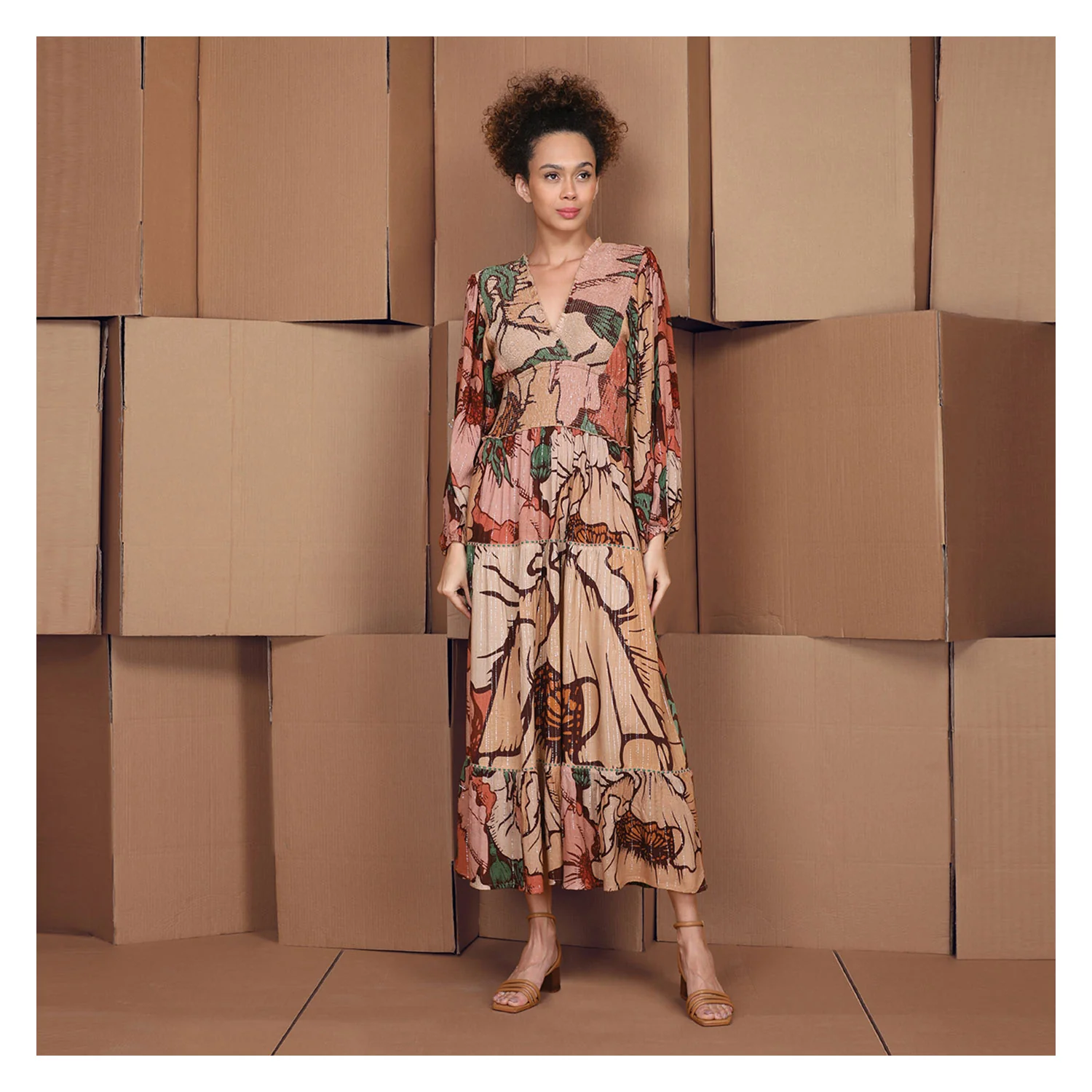 The Anouk dress is a nod to our heritage, with a modern twist. The rayon fabric has a gleaming silver lurex thread woven through it, making this the perfect for your next big event in a vintage flora print. The smocked body and lace detail give an elegant feel to this dress, that is sure to be timeless, with full sleeves and elasticated cuffs. Pair with your favorite heels.
