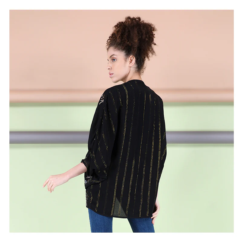 This style will have you ready and dressed for the day, no matter what the occasion is! Lurex stripes add a shimmering look to the silhouette, with intricate floral sequins and added lace at sides. This cute coverup can be dressed up or down with simple accessories and paired with any bottoms you'd like! Ideal with your favorite cut-off shorts or denims and sandals/boots for the perfect everyday outfit.